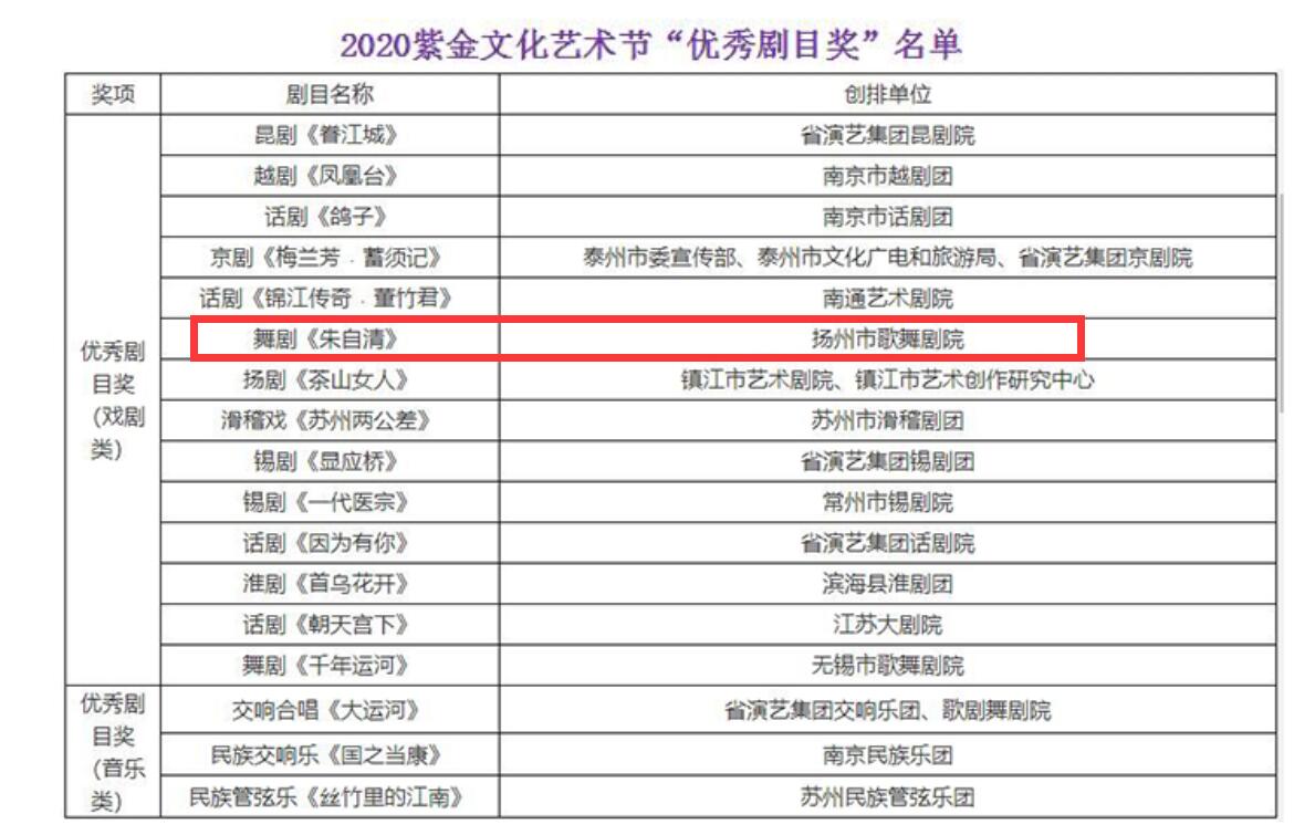 10月30日晚,江蘇大劇院綜藝廳燈光璀璨,“花開盛世——2020紫金文化藝術(shù)節(jié)頒獎儀式”隆重舉行。由揚州市文化廣電和旅游局、揚州市歌舞劇院有限公司出品的舞劇《朱自清》榮獲“優(yōu)秀劇目獎”,朱自清飾演者周晨榮獲“優(yōu)秀表演獎”。