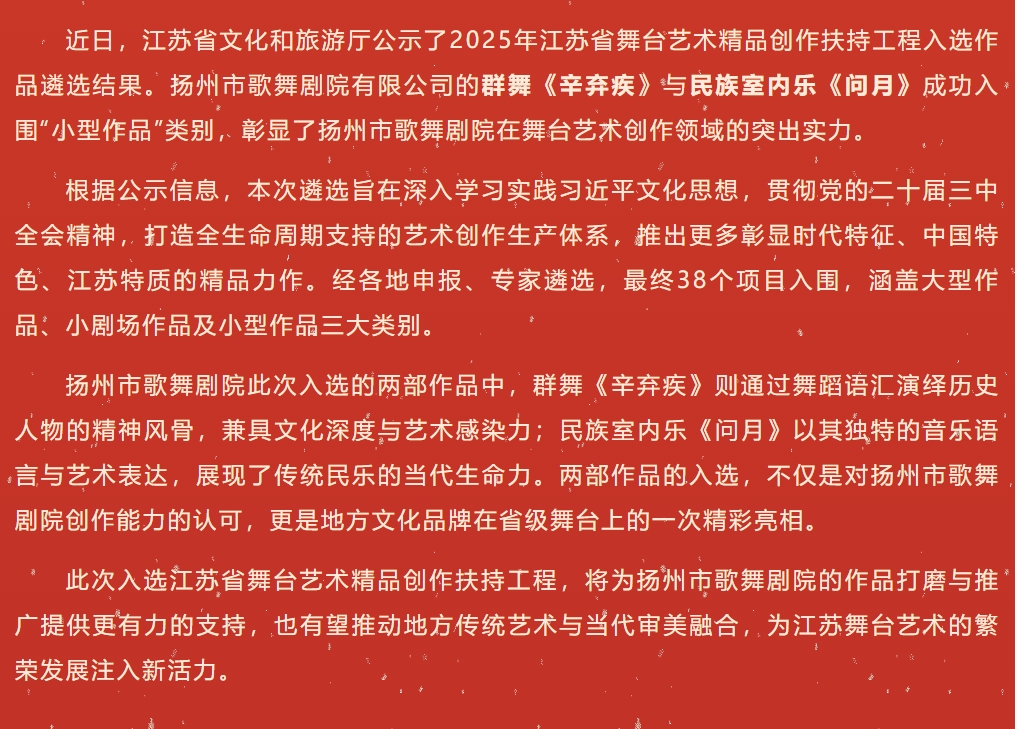 喜報 | 揚州市歌舞劇院兩作品入選2025年江蘇省舞臺藝術(shù)精品創(chuàng)作扶持工程!